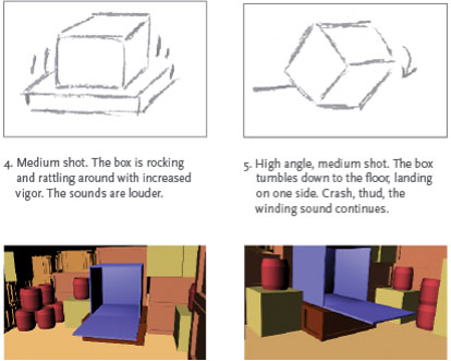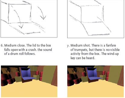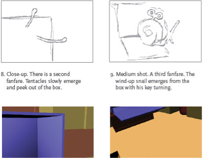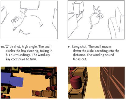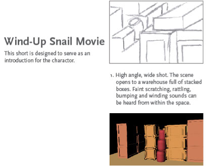 Originally in 2-D, this is the storyboard for the "Introducing the Wind-Up Snail" animated short. The 3-D scenes were created using Autodesk Maya. The character development for the WindUp Snail can be viewed here.