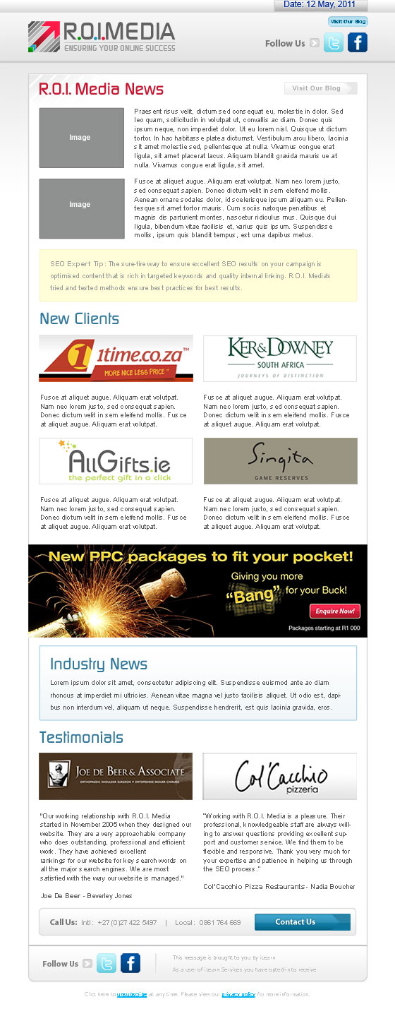 The task was to design an email newsletter consistent with existing branded materials, as well as a banner advertising new pay-per-click service packages. A list of desired content was provided. At this point it was handed off to the copywriters.