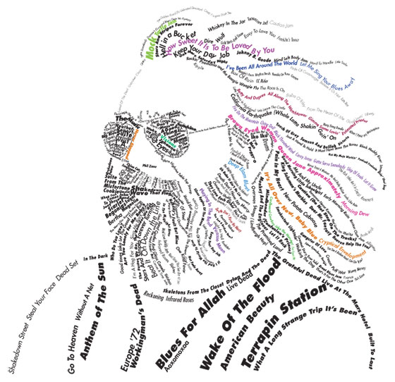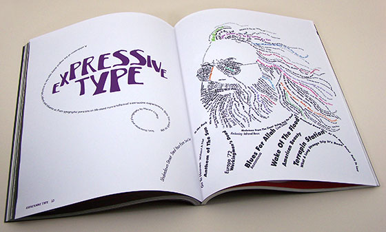 The Expressive Type spread was created as a ‘60’s influenced showcase for the typographic portrait of Jerry Garcia. Created using Adobe Illustrator, his head is composed of Grateful Dead song titles, with his shoulders shaped out of their album titles.