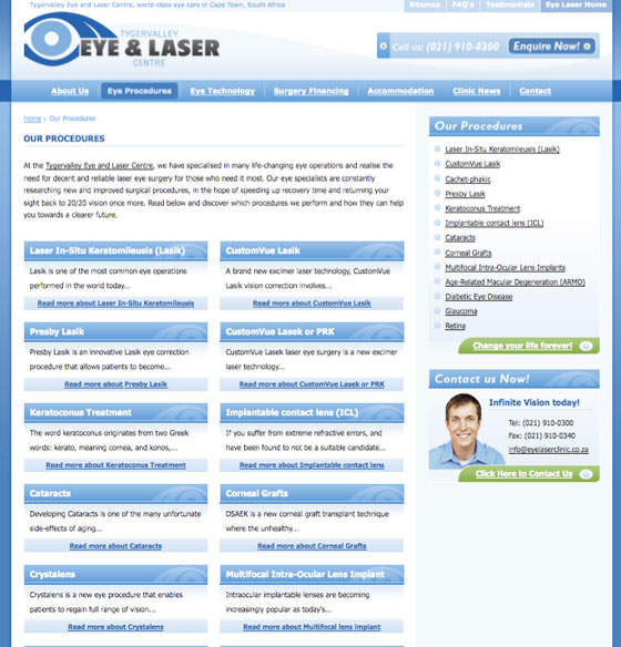 I have done a great deal of work within the Eye & Laser Clinic website. It is a large site, not template-based, and the client was going through the entire site making lots of little changes—adding, subtracting, relocating and deleting information.