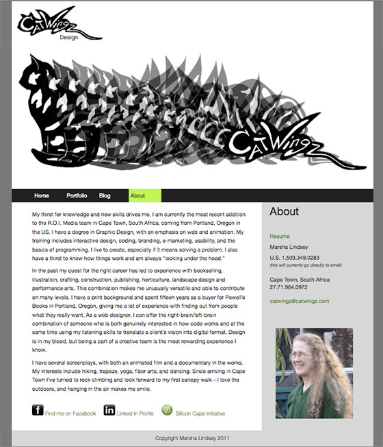 This is the third major redesign for the Catwingz site. In time it will host some e-commerce, but for the moment it is playing host to my blog and portfolio sites. The design is a modification of the template I chose for the blog, and I did all of the coding and CSS. The email spam filter is a javascriot scrambler. The animation frames of the winged cat in the banner are from the long-postponed plan to animate my logo.