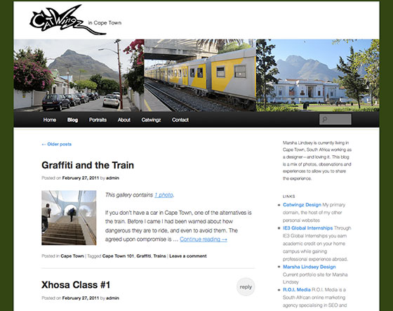 Catwingz in Cape Town is my first personal blog. It is serving as a combination travel diary, display venue for my photography and a testing bed for various Wordpress plug-ins and techniques. The presence of a direct link back to Catwingz in the navigation bar is thanks to a snippet of inserted PHP. As time allows it will acquire added functionality.