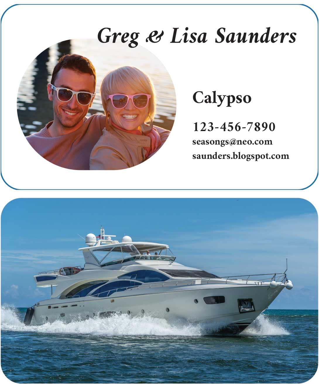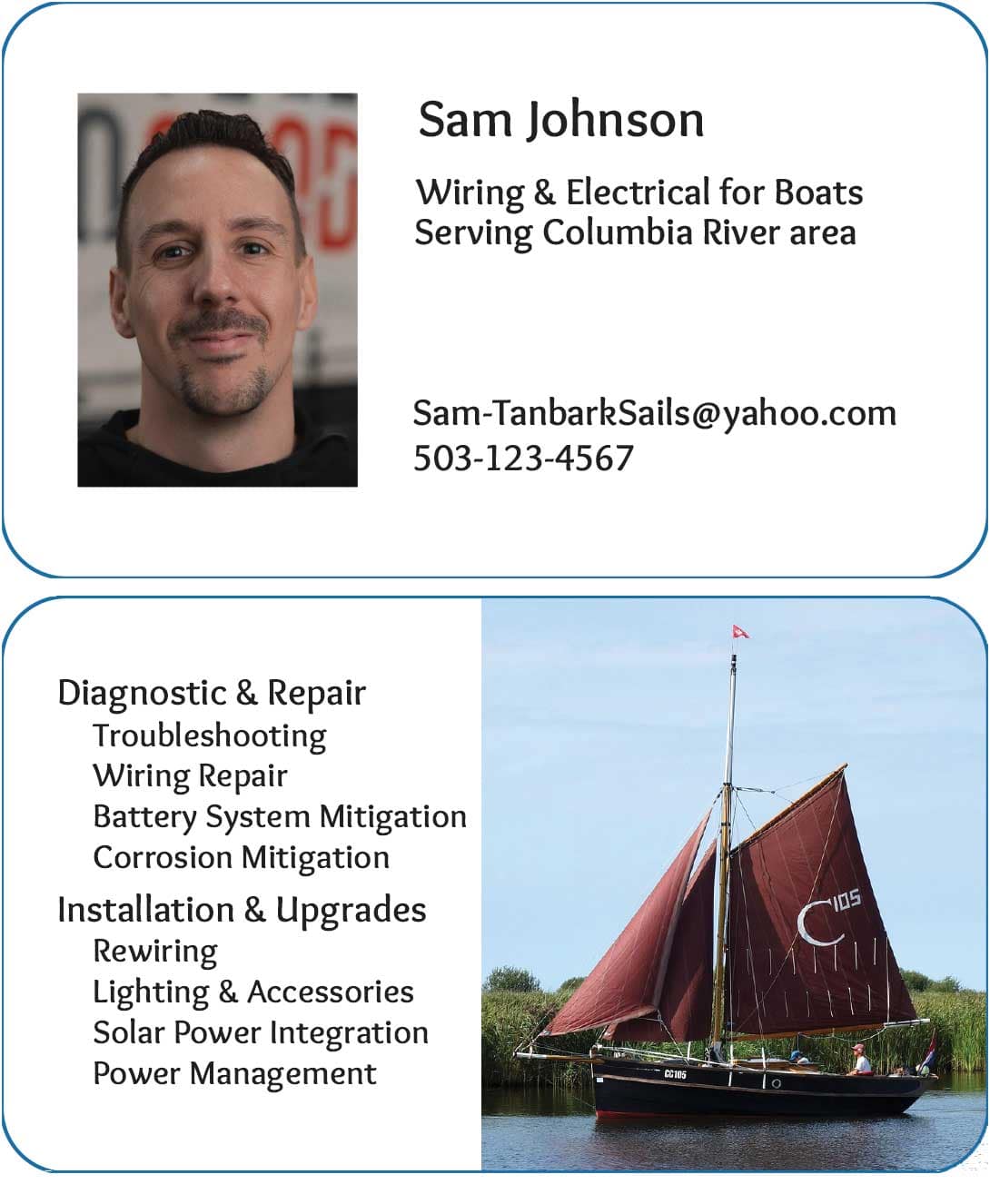 Business Card for Man offering Wiring & Electrical Services for Boats