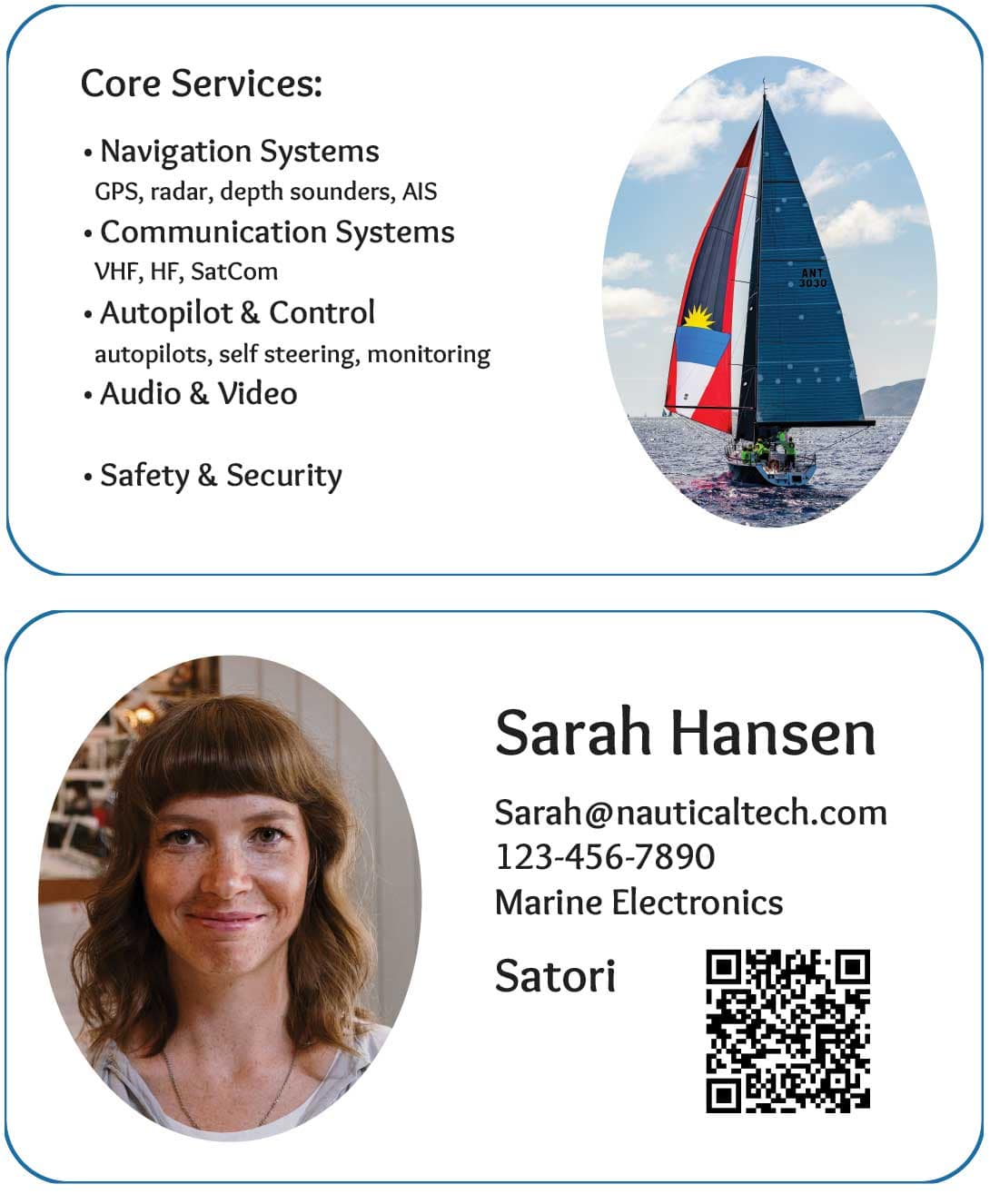 Business Card for Woman offering Marine Electronics Services